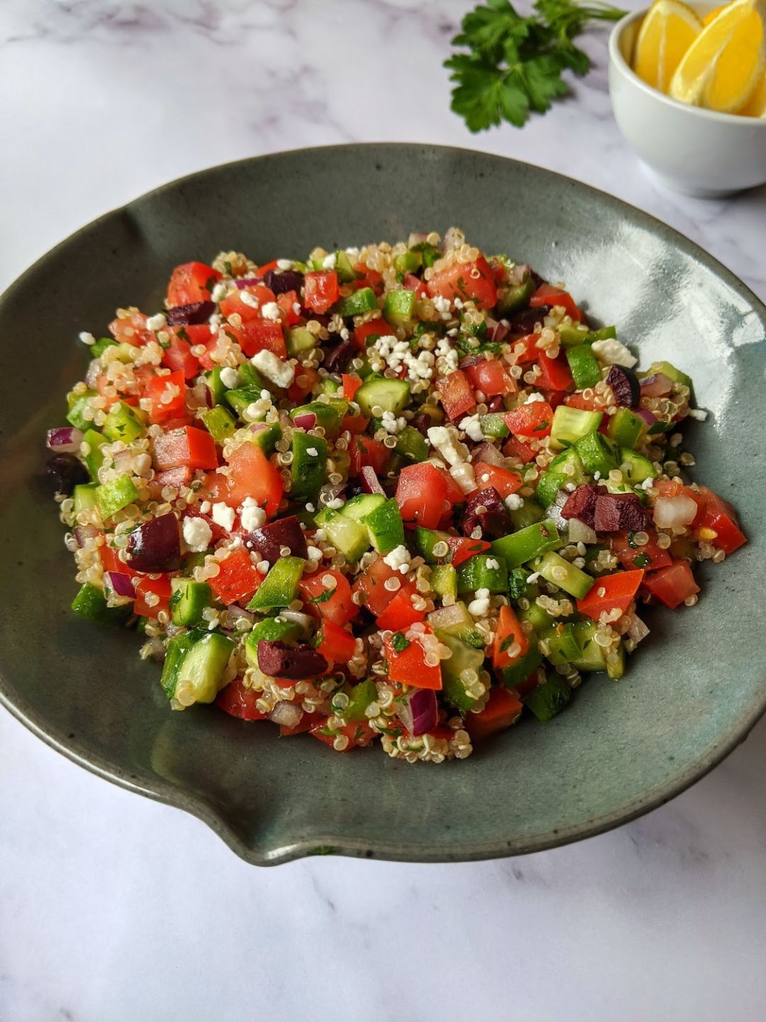 Pica y mezcla todos los ingredientes, combinando suavemente con la quinoa al final. Agrega el aceite, el jugo de limón, el vinagre, la sal, pimienta, mezcle y sirve o refrigera para que la disfrutes fría y los sabores se unan más.
