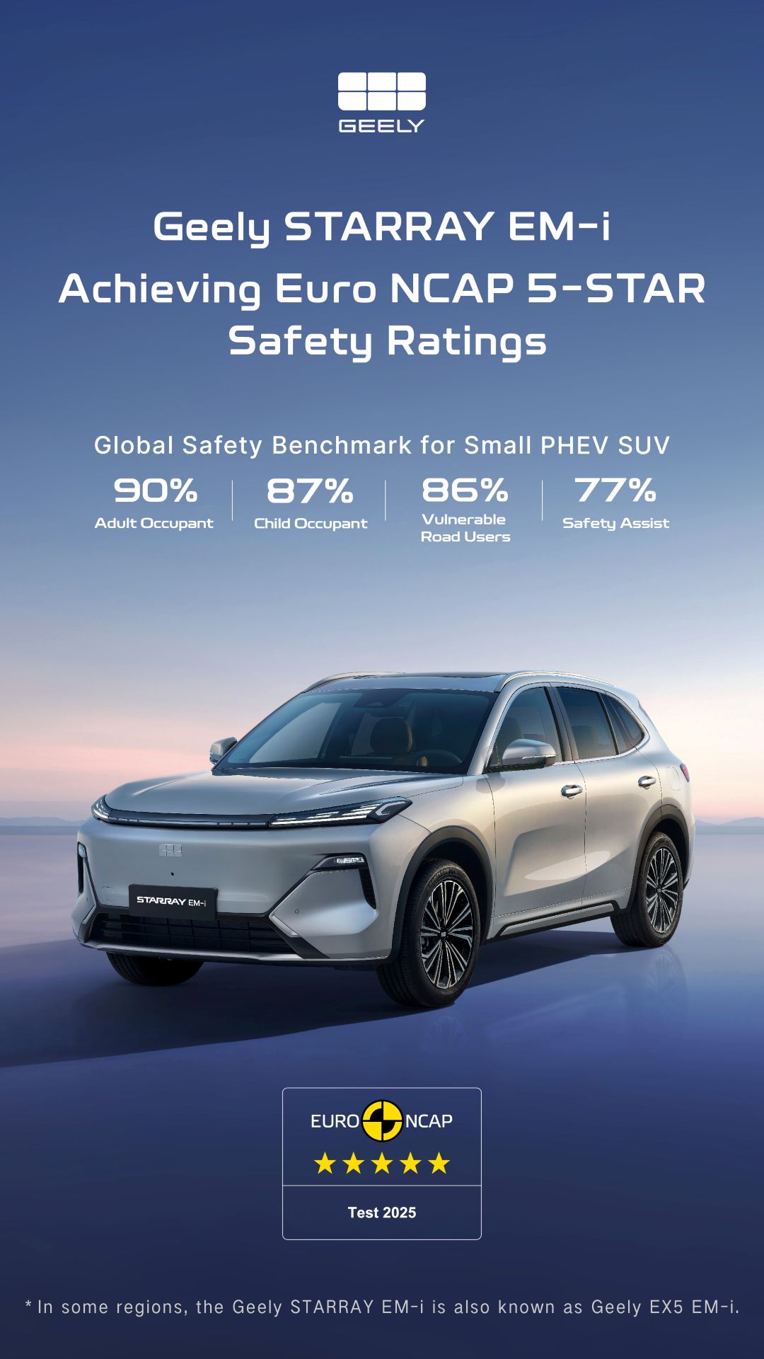 Geely Auto informó que su primer SUV híbrido enchufable global, el Geely STARRAY EM-i (también conocido como Geely EX5 EM-i en algunas regiones), obtuvo la prestigiosa calificación de cinco estrellas del Euro NCAP (Programa Europeo de Evaluación de Autos Nuevos). Este hito representa el segundo reconocimiento de cinco estrellas para la línea de vehículos de nueva energía de Geely, reforzando el liderazgo de la marca en tecnologías globales de seguridad y su compromiso permanente con la protección de los usuarios.