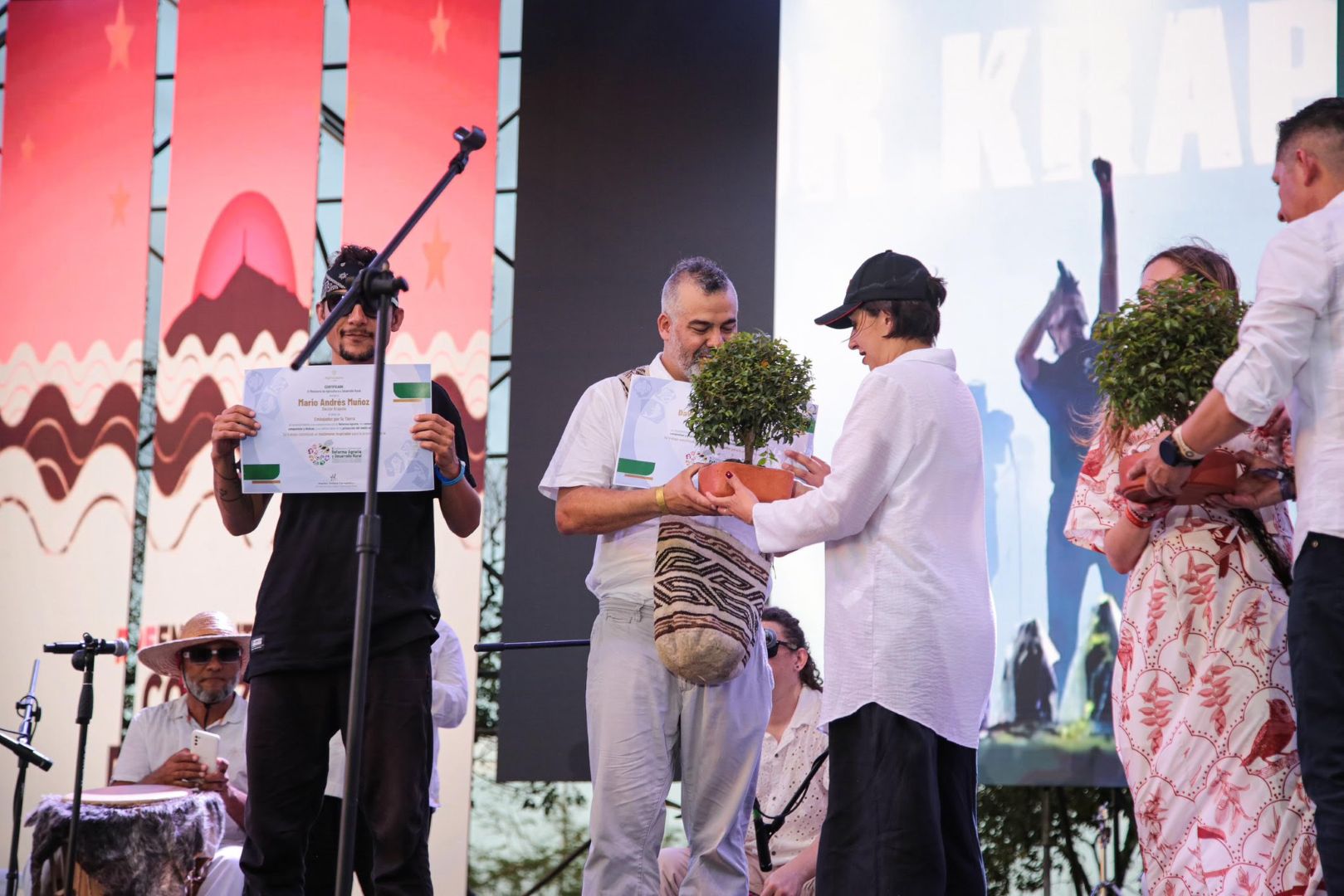 Durante el evento "Raíces de la dignidad: memoria viva de las luchas agrarias de la Unión Patriótica", la Ministra de Agricultura y Desarrollo Rural de Colombia, Martha Carvajalino, hizo entrega del reconocimiento como "Embajadores por la Tierra" a Mario Muñoz (Subcantante) y David Jaramillo (David Kawooq).