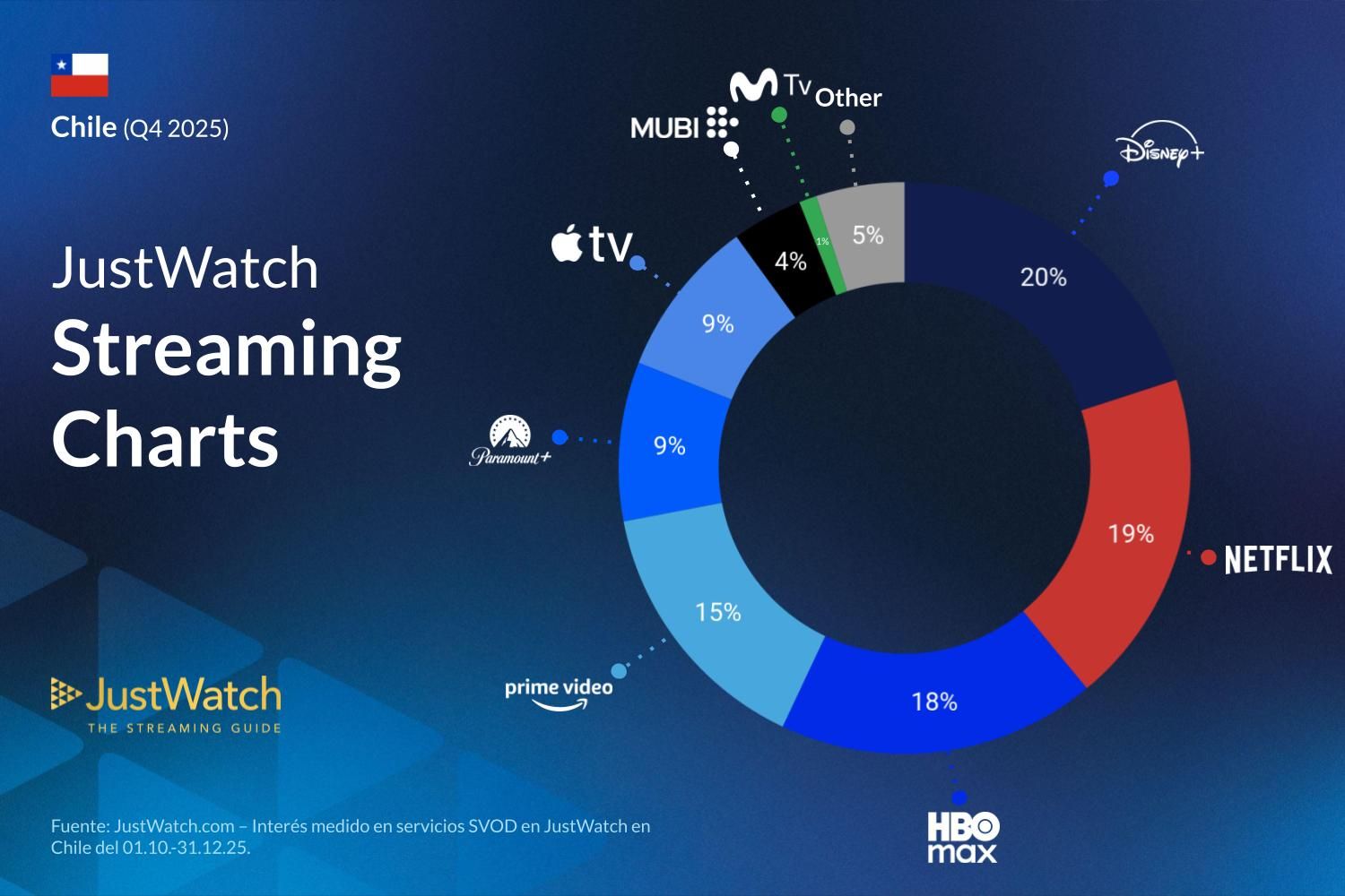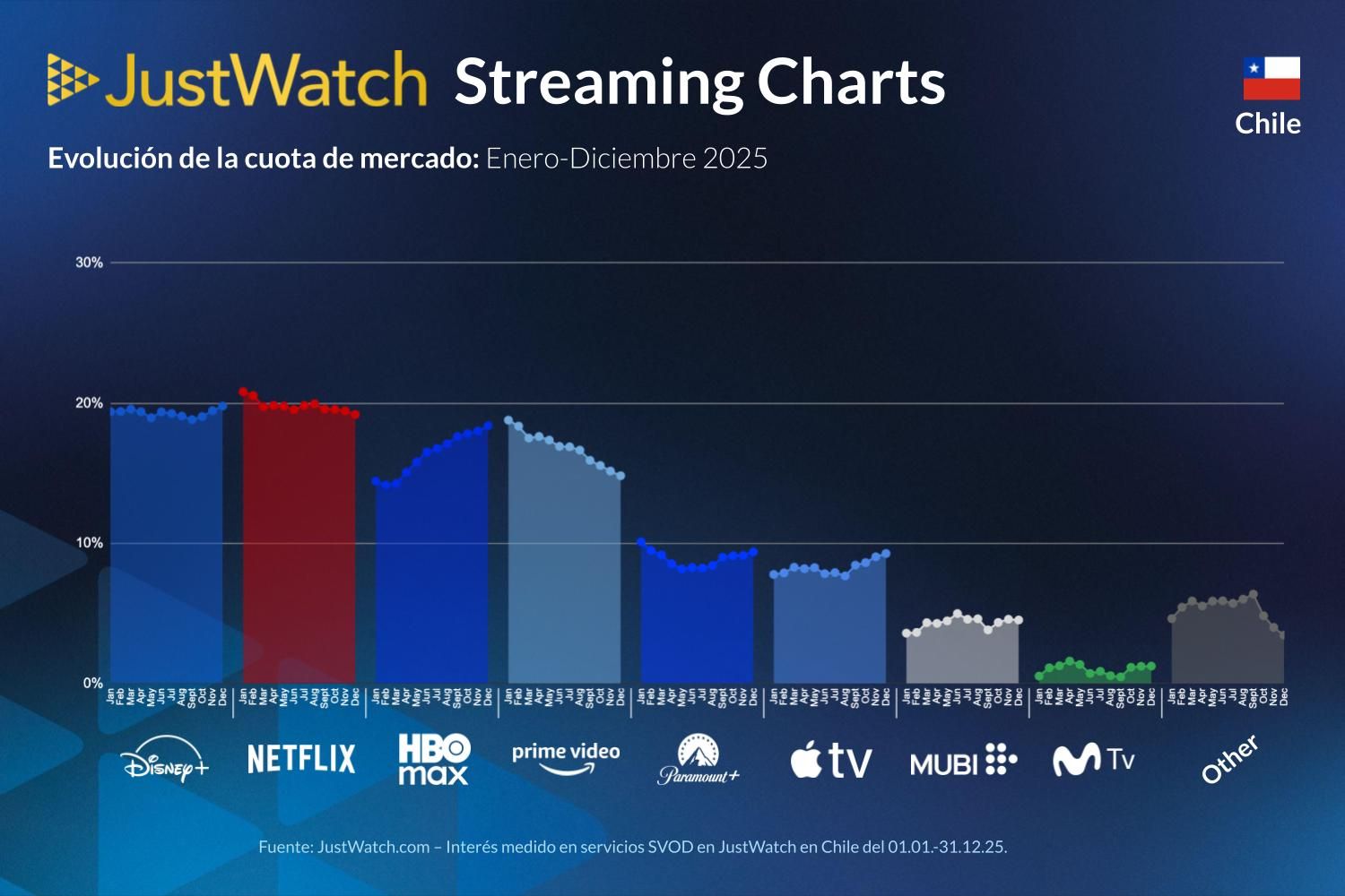 Les queremos presentar la última actualización de las cuotas de mercado SVOD de JustWatch para Chile correspondiente al cuarto trimestre de 2025. La campaña de Market Shares ofrece una visión trimestral de cómo se posicionan las principales plataformas de streaming en el mercado local y cómo evolucionan sus participaciones a lo largo del tiempo.