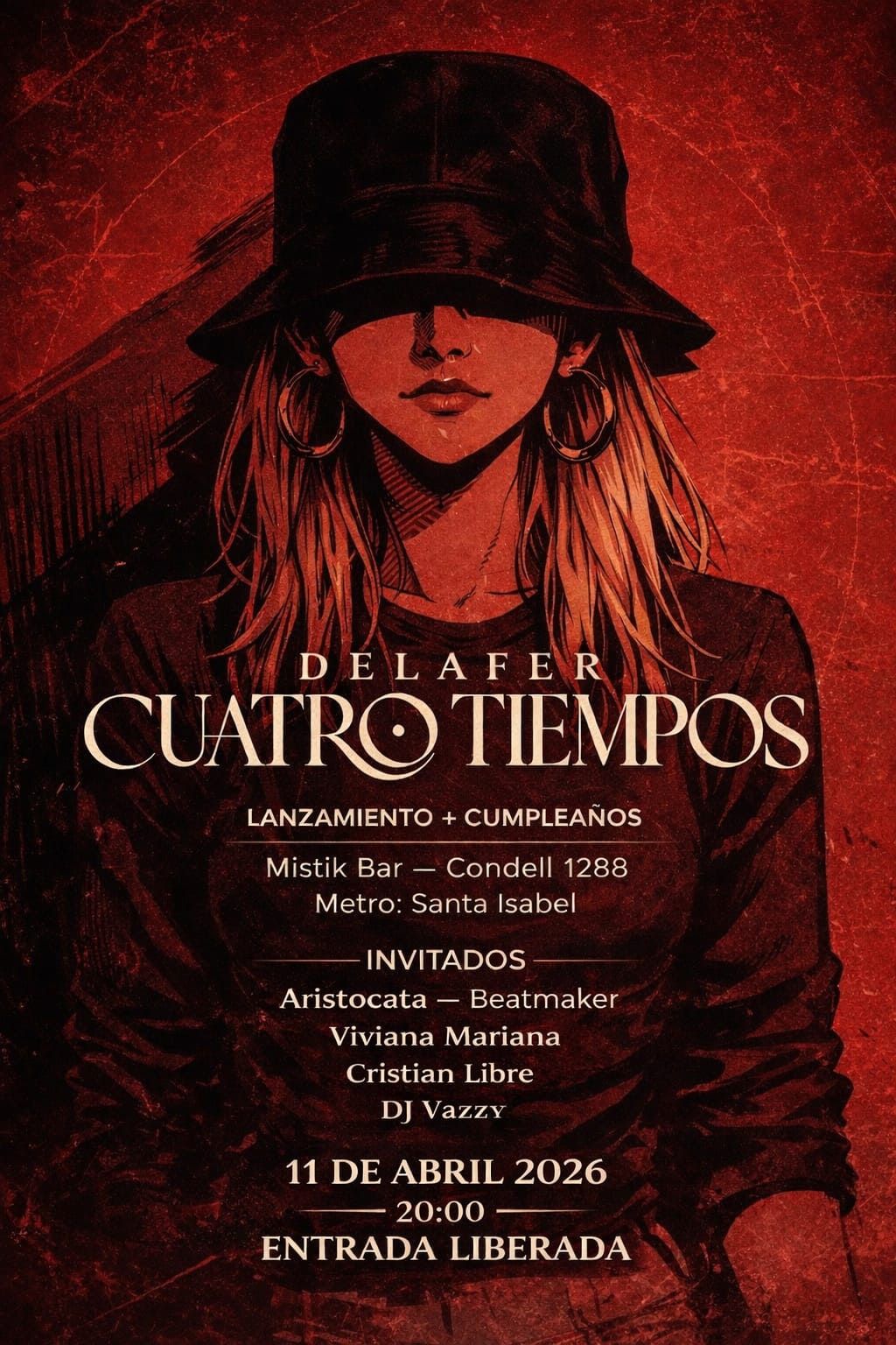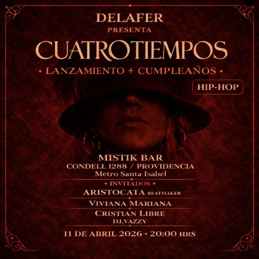 El estreno en vivo de "Cuatro Tiempos" será este sábado 11 de abril con un show que través de un puñado actos emocionales track by track, la rapera chilena Delafer redefinirá el hip hop de poesía y beats en MitiK Bar (ver afiche).