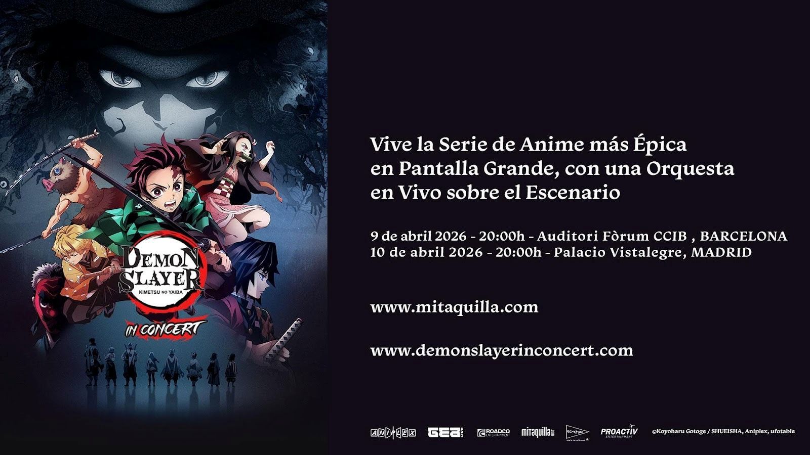 Una de las franquicias japonesas de anime y manga más exitosas de los últimos años desembarca en España con una experiencia musical única. Demon Slayer: Kimetsu no Yaiba In Concert se presentará por primera vez en nuestro país el 9 de abril de 2026 en el Auditori Fòrum CCIB de Barcelona y el 10 de abril de 2026 en el Palacio Vistalegre de Madrid.
