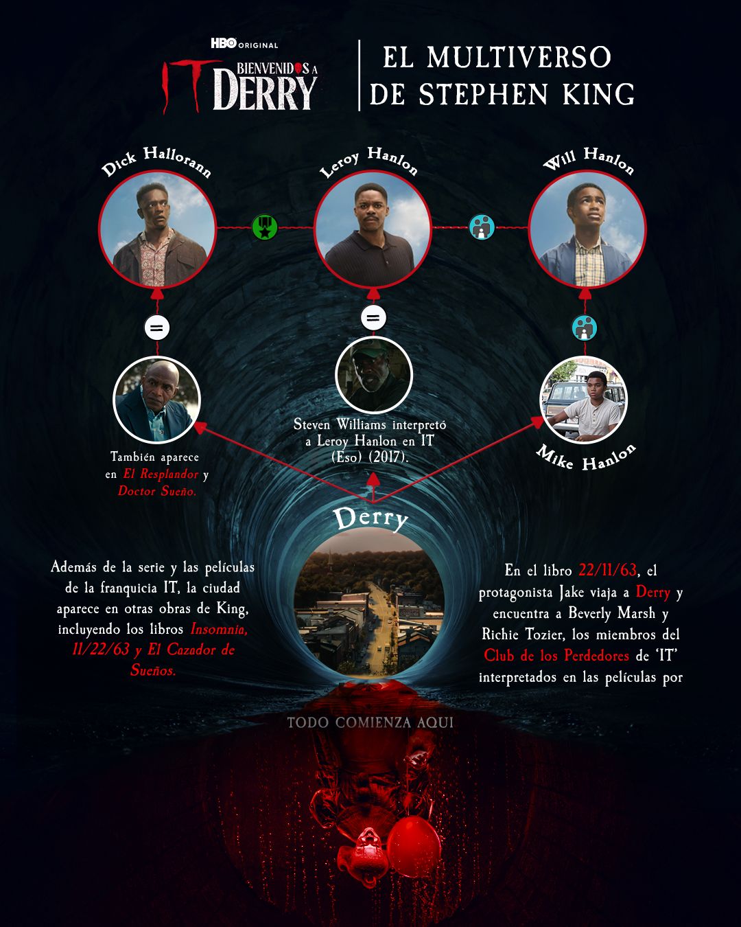 Con el estreno de los nuevos episodios de IT: BIENVENIDOS A DERRY, HBO expande el multiverso de Stephen King al mostrar cómo personajes clásicos y nuevas figuras se entrelazan en la historia oscura de la ciudad. Ambientada décadas antes de los acontecimientos retratados en las películas de la franquicia IT, la serie explora relaciones y referencias presentes en otras obras del autor, reforzando a Derry como uno de los escenarios más emblemáticos y recurrentes del terror moderno.