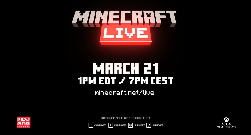Mojang anunció que Minecraft LIVE se llevará a cabo el sábado 21 de marzo. La transmisión comenzará con un preshow de la comunidad a las 9:30 a. m. PT, seguido del evento principal a las 10 a. m. PT.