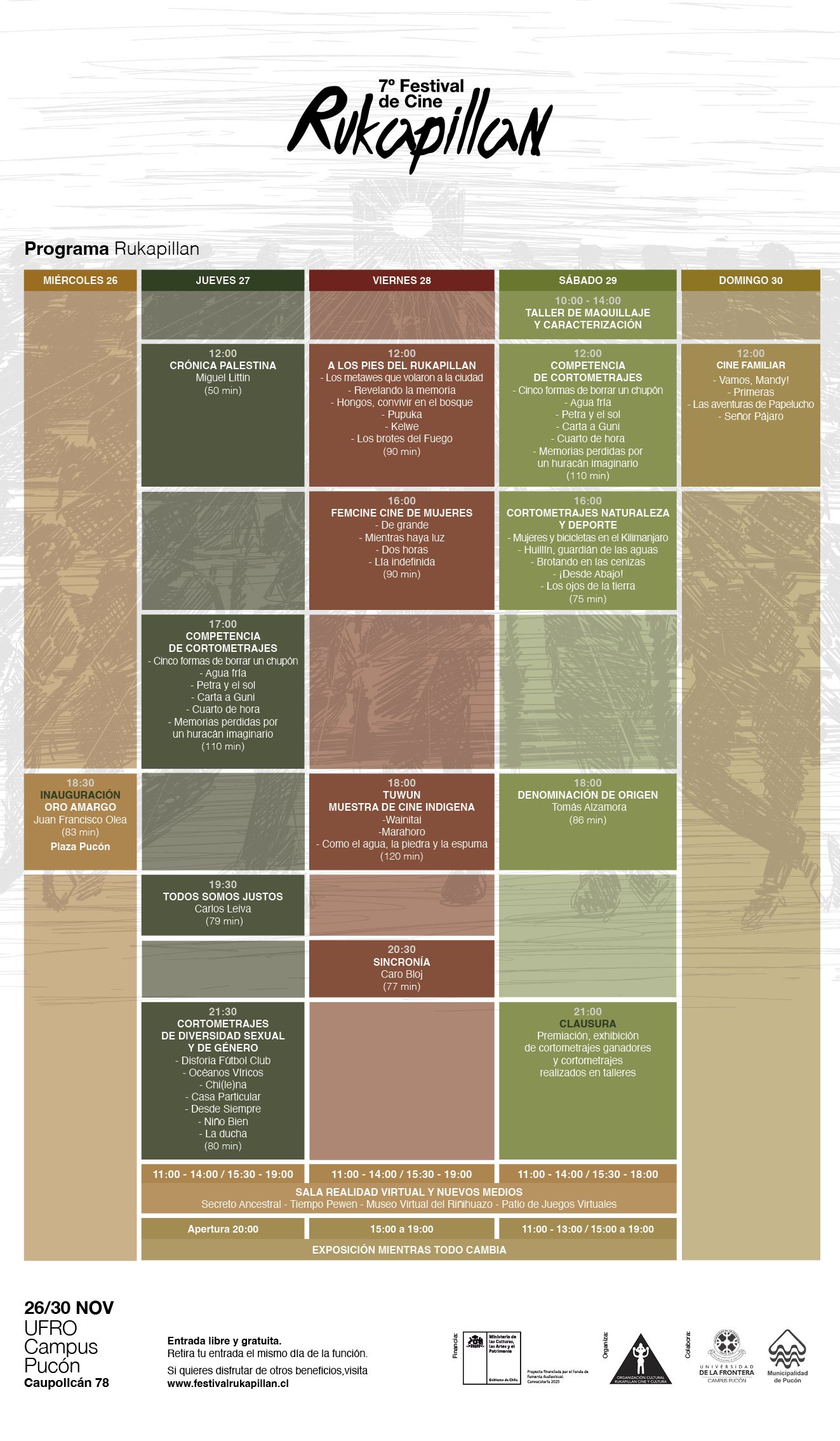 En un evento realizado en la Universidad de La Frontera en Temuco, el Festival de Cine Rukapillan presentó oficialmente, ante autoridades y prensa local, la programación de su séptima edición que se desarrollará entre el 26 y el 30 de noviembre en el campus Pucón de la misma universidad.