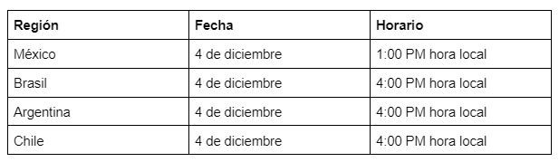 Para obtener más detalles sobre el calendario de retransmisiones en directo, consulta la siguiente tabla: