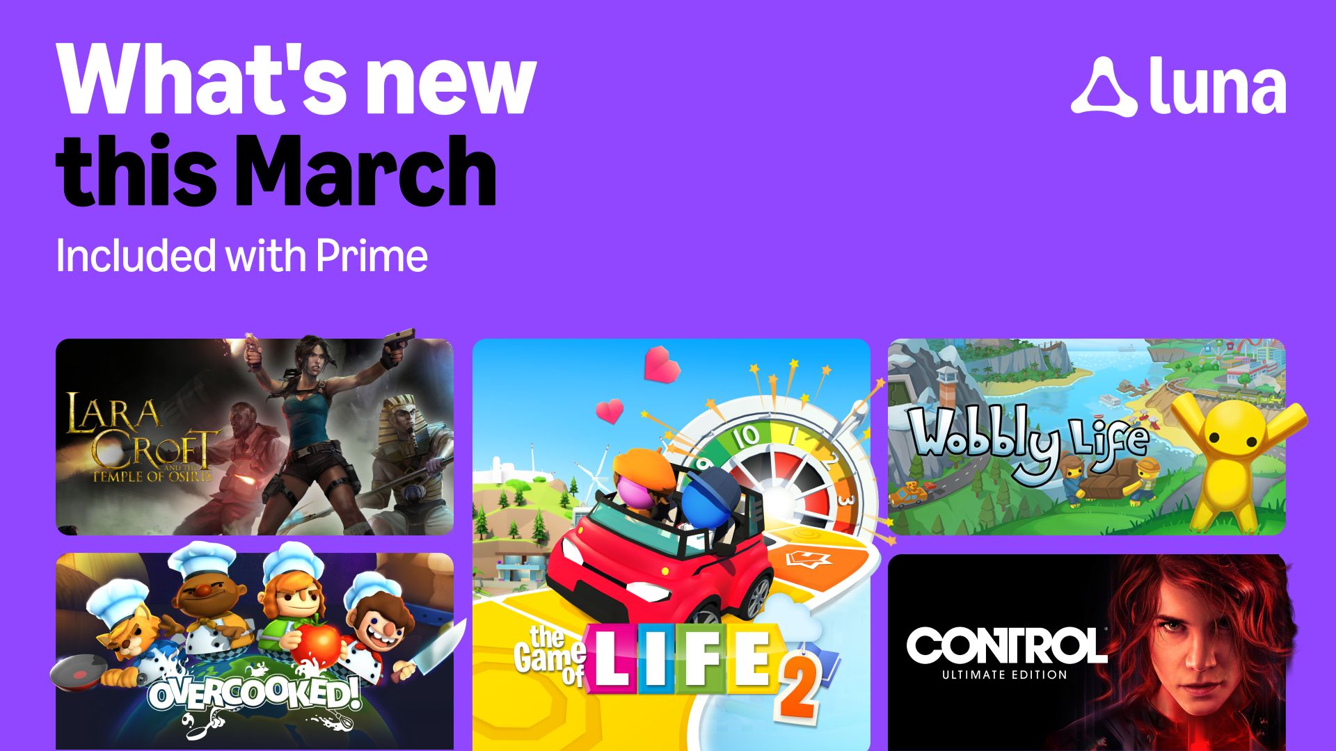 ¡Marzo arranca con fuerza con la actualización de contenidos de Luna! Luna se prepara con la lista actualizada de juegos para entretenerte a lo largo del mes. Juega en Luna con tu membresía Prime: una suscripción “todo en uno” que ofrece ahorros, comodidad y entretenimiento. Con Luna, los Miembros Prime pueden disfrutar de una creciente librería de más de 50 juegos donde el servicio en la nube de Luna esté disponible y una colección rotativa mensual de juegos de PC descargables.
