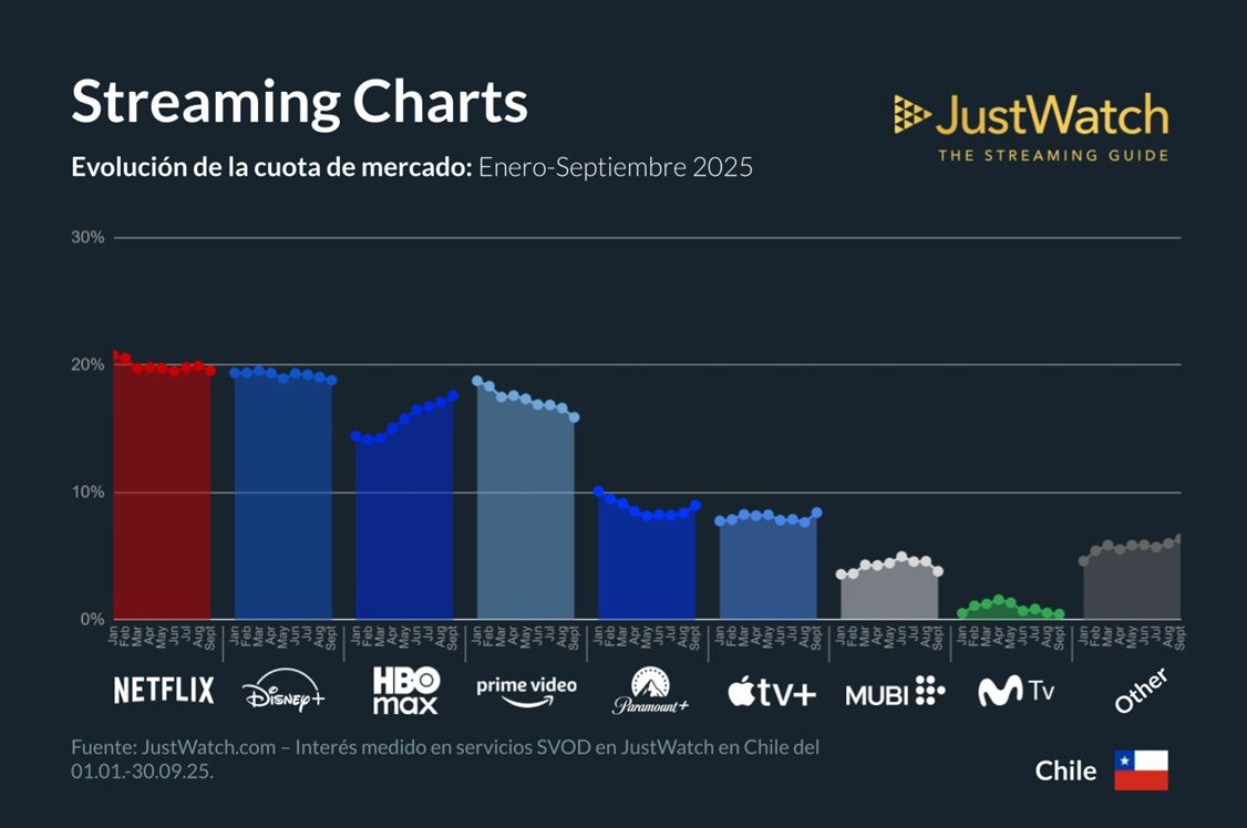 En la comparación interanual, el mercado chileno refleja una disminución del dominio tradicional de Netflix y una competencia más equilibrada entre las plataformas líderes: