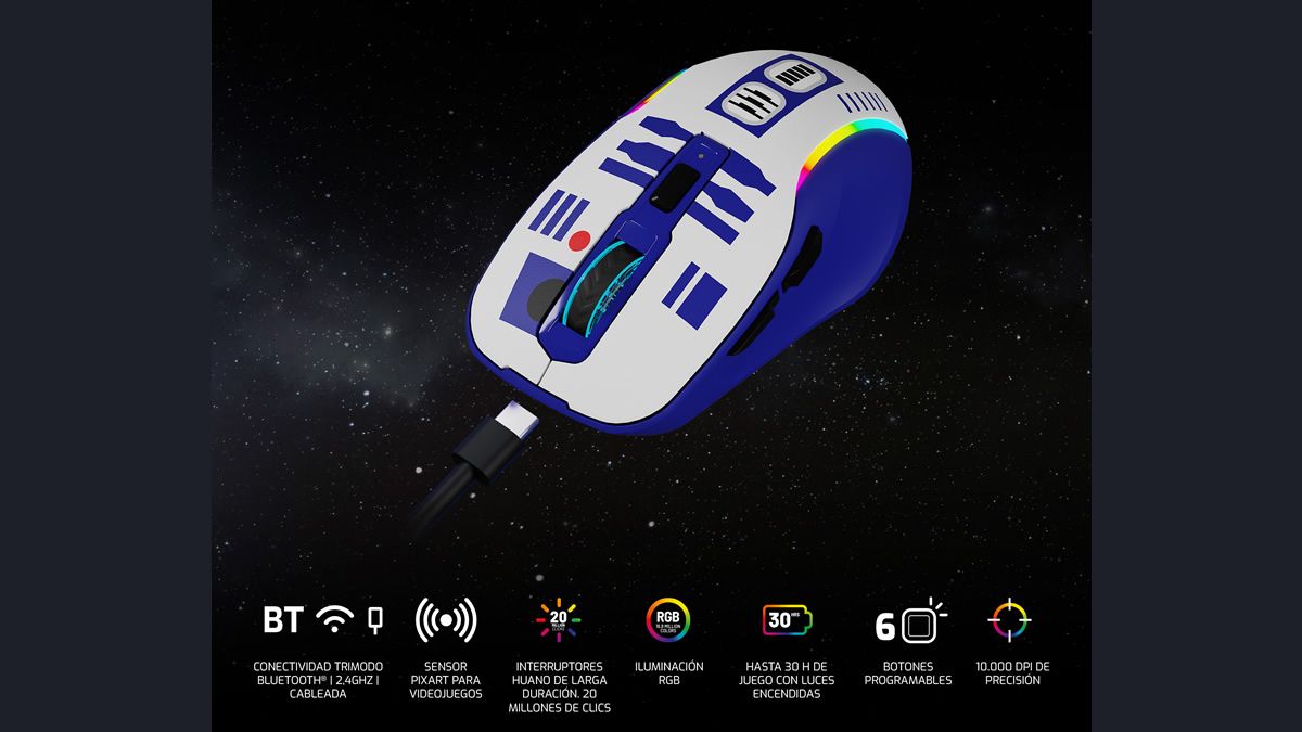 El mouse GLADIUSTM10, modelo PMO-S204DR, viene con un exclusivo diseño inspirado en R2-D2. Se destaca por su conectividad trimodo que permite conexión Bluetooth, 2,4 GHz o por cable USB-C, ofreciendo versatilidad para cambiar de plataforma sin perder tiempo. Cuenta con interruptores mecánicos Huano de alto desempeño, con una vida útil de hasta 20 millones de clics.