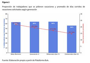 La Generación Z (nacidos entre 1997 y 2012), no solo es el grupo que menos solicita vacaciones (56%), sino que además concentra los períodos de descanso más breves, con un promedio de 14,7 días corridos anuales. En contraste, los Baby Boomers (nacidos entre 1946-1964) registran los mayores niveles de descanso, con un promedio de 21,8 días corridos al año.