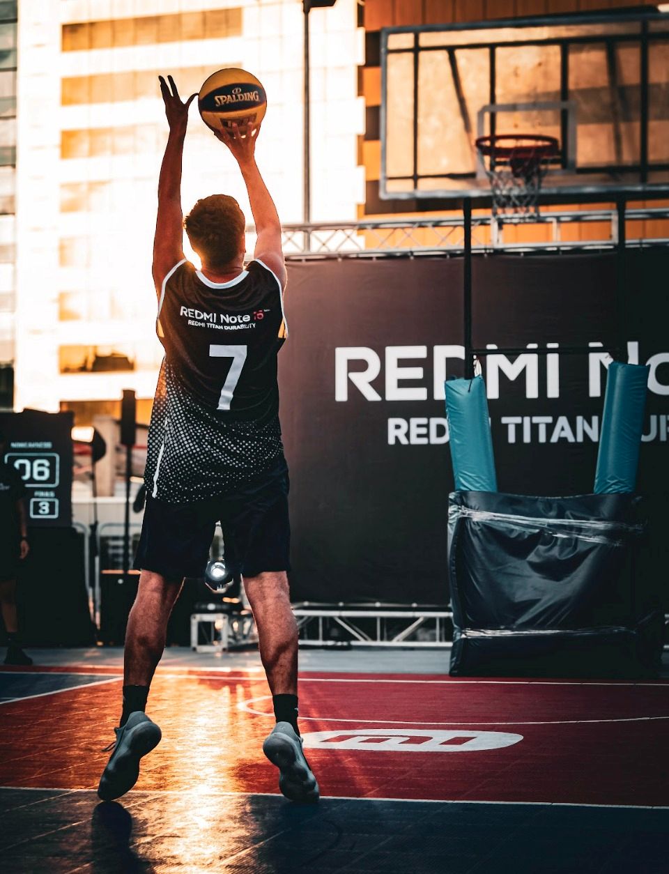 Los deportistas tomaron el REDMI Note 15 Pro+ como si fuera el balón y lo lanzaron con fuerza directamente por el aro de básquetbol. Tras atravesar la red y caer de lleno contra la dureza del suelo de la cancha.