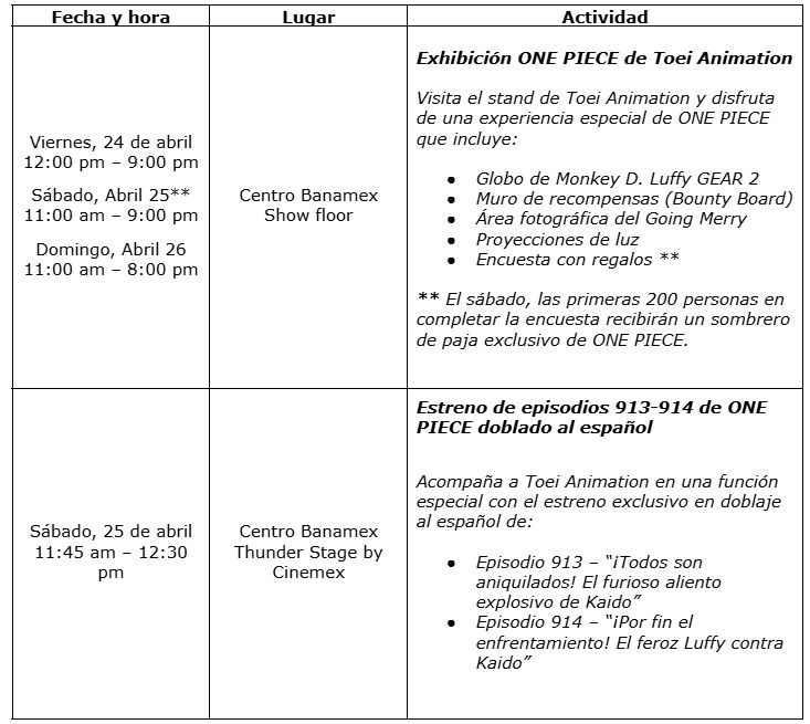 Ahora, los fans en México tendrán la oportunidad de vivir ONE PIECE como nunca antes. La exhibición de Toei Animation incluirá un impresionante stand a gran escala en el show floor, así como la proyección exclusiva de los episodios 913 y 914 con doblaje al español en el Thunder Stage by Cinemex.
